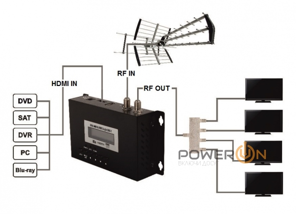 Full HD модулятори - застосовується для підключення ресивера або іншого пристрою (DVD та Bly-Ray плеєра, планшета, смартфона, комп'ютера ПК, відеокамери, все що має HDMI вихід) з подальшою роздачею цифрового сигналу на кілька телевізорів по антеновому кабелю у форматі DVB-T.